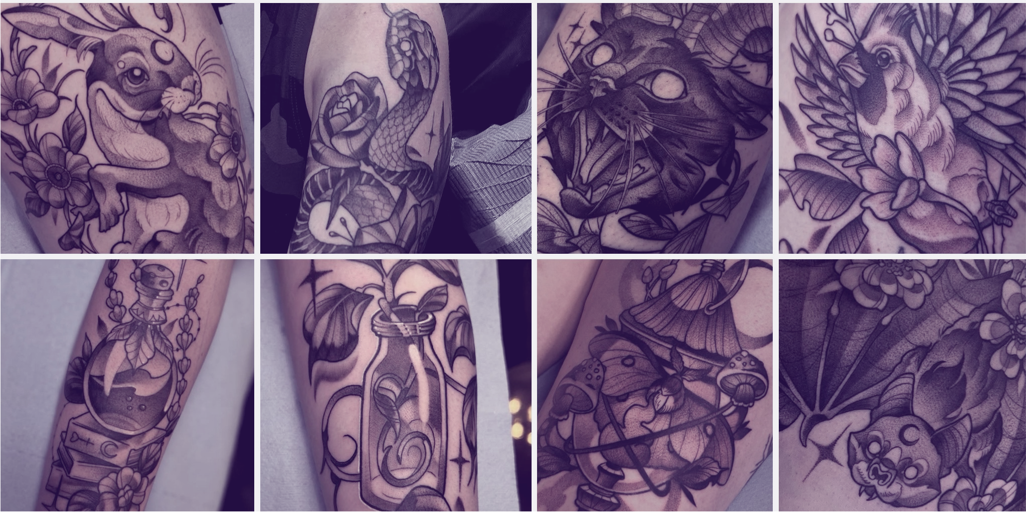 I’m a tattooer currently based in South Florida! My favorite things to tattoo include florals, animals, and nature; with a tilt toward the magical cottage core or themes of death. I’m looking to expand my portfolio of larger scale work. Torsos, backs, legs, etc. If that excites you, contact me!